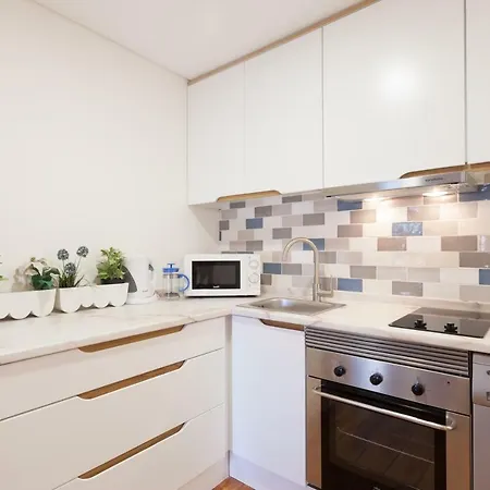 Feels Like Home Principe Real Comfortable Flat的房间内有微波炉,电热水壶和厨具. 它距离雷斯多拉多雷斯地铁站有10分钟的步行路程.